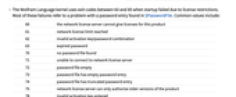 60 the network license server cannot give licenses for this product 61 network license limit reached 62 invalid activation key/password combination 63 expired password 70 no password file found 71 unable to connect to network license server 72 password file empty 73 password file has empty password entry 74 password file has truncated password entry 75 network license server can only authorize older versions of the product 78 invalid activation key entered 81 the network license server instructed the kernel to terminate 82 the network license server refused to give a license 84 the network license server refused to give a license due to a configured restriction 85 single-machine process limit reached - Exit[…] is a synonym for Quit[…].
