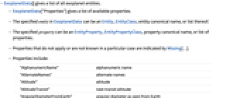 "PeriapsisLongitudeInterval" lower and upper bounds of the longitude of periapsis "PlanetaryEquilibriumTemperature" planetary equilibrium temperature "PlanetaryEquilibriumTemperatureInterval" lower and upper bounds of the planetary equilibrium temperature "PrimaryStarKSemiamplitude" primary star K semiamplitude "Radius" average radius "RadiusInterval" lower and upper bounds of the radius "RightAscension" right ascension "RiseTime" next rise "RocheLimit" Roche limit "SemimajorAxis" semimajor axis "SemimajorAxisInterval" lower and upper bounds of the semimajor axis "SemiminorAxis" semiminor axis "SetTime" next set "SiderealHourAngle" sidereal hour angle "SurfaceArea" surface area "TransitDepth" transit depth "TransitTime" next transit time "Volume" volume - Some properties are available for ExoplanetData as a whole and can be given using the form ExoplanetData[property]. Such properties include: