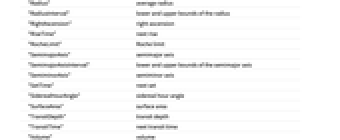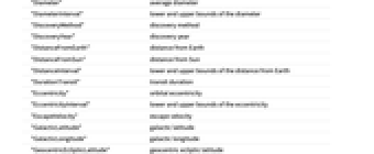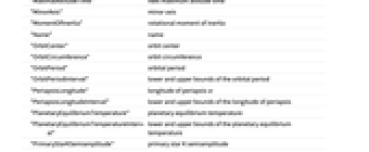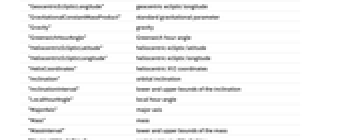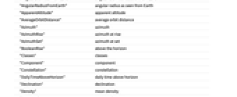 "AlphanumericName" alphanumeric name "AlternateNames" alternate names "Altitude" altitude "AltitudeTransit" next transit altitude "AngularDiameterFromEarth" angular diameter as seen from Earth "AngularRadiusFromEarth" angular radius as seen from Earth "ApparentAltitude" apparent altitude "AverageOrbitDistance" average orbit distance "Azimuth" azimuth "AzimuthRise" azimuth at rise "AzimuthSet" azimuth at set "BooleanRise" above the horizon "Classes" classes "Component" component "Constellation" constellation "DailyTimeAboveHorizon" daily time above horizon "Declination" declination "Density" mean density "Diameter" average diameter "DiameterInterval" lower and upper bounds of the diameter "DiscoveryMethod" discovery method "DiscoveryYear" discovery year "DistanceFromEarth" distance from Earth "DistanceFromSun" distance from Sun "DistanceInterval" lower and upper bounds of the distance from Earth "DurationTransit" transit duration "Eccentricity" orbital eccentricity "EccentricityInterval" lower and upper bounds of the eccentricity "EscapeVelocity" escape velocity "GalacticLatitude" galactic latitude "GalacticLongitude" galactic longitude "GeocentricEclipticLatitude" geocentric ecliptic latitude "GeocentricEclipticLongitude" geocentric ecliptic longitude "GravitationalConstantMassProduct" standard gravitational parameter "Gravity" gravity "GreenwichHourAngle" Greenwich hour angle "HeliocentricEclipticLatitude" heliocentric ecliptic latitude "HeliocentricEclipticLongitude" heliocentric ecliptic longitude "HelioCoordinates" heliocentric XYZ coordinates "Inclination" orbital inclination "InclinationInterval" lower and upper bounds of the inclination "LocalHourAngle" local hour angle "MajorAxis" major axis "Mass" mass "MassInterval" lower and upper bounds of the mass "MaximalAltitudeTime" next maximum altitude time "MinorAxis" minor axis "MomentOfInertia" rotational moment of inertia "Name" name "OrbitCenter" orbit center "OrbitCircumference" orbit circumference "OrbitPeriod" orbital period "OrbitPeriodInterval" lower and upper bounds of the orbital period "PeriapsisLongitude" longitude of periapsis