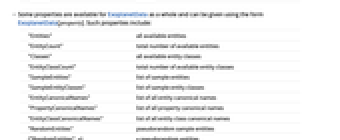 "Entities" all available entities "EntityCount" total number of available entities "Classes" all available entity classes "EntityClassCount" total number of available entity classes "SampleEntities" list of sample entities "SampleEntityClasses" list of sample entity classes "EntityCanonicalNames" list of all entity canonical names "PropertyCanonicalNames" list of all property canonical names "EntityClassCanonicalNames" list of all entity class canonical names "RandomEntities" pseudorandom sample entities {"RandomEntities",n} n pseudorandom entities "RandomEntityClasses" pseudorandom sample entity classes {"RandomEntityClasses",n} n pseudorandom entity classes - The following annotations can be used in the third argument of ExoplanetData[entity,property,annotation]: