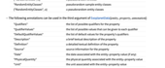 "Qualifiers" the list of possible qualifiers for the property "QualifierValues" the list of possible values that can be given to each qualifier "DefaultQualifierValues" the list of default values for the property's qualifiers "Description" a brief textual description of the property "Definition" a detailed textual definition of the property "Source" source information for the property "Date" the date associated with the entity-property value (if any) "PhysicalQuantity" the physical quantity associated with the entity-property value "Unit" the unit associated with the entity-property value "EntityAssociation" an association of entities and entity-property values "PropertyAssociation" an association of properties and entity-property values - If a function is provided as an annotation, it will be used to aggregate the result data. Typical aggregation functions include: