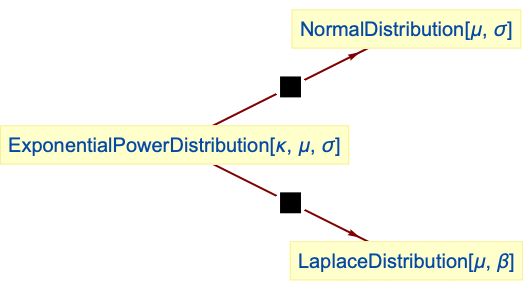 - The exponential power distribution is related to a number of other distributions. For example, ExponentialPowerDistribution is an obvious generalization of NormalDistribution, in the sense that the PDF of ExponentialPowerDistribution[2,μ,σ] is identically that of NormalDistribution[μ,σ]. ExponentialPowerDistribution also generalizes LaplaceDistribution, in the sense that ExponentialPowerDistribution[1,μ,β] has the same CDF as LaplaceDistribution[μ,β]. The distribution of length of a random vector from DirichletDistribution can be modeled smoothly by ExponentialPowerDistribution. Additionally, ExponentialPowerDistribution is qualitatively related to StudentTDistribution, ChiDistribution, MaxwellDistribution, RayleighDistribution, and RiceDistribution.