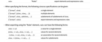 {"format",elem} a single element {"format",{elem1,elem2,…}} multiple elements {"format",elem1,sublelem1,…} subelements of subelements of elem1 {"format",rules} export elements and expressions rules - When exporting using the "Rules" element, rules can have the following forms: