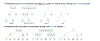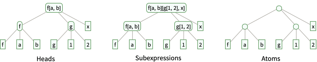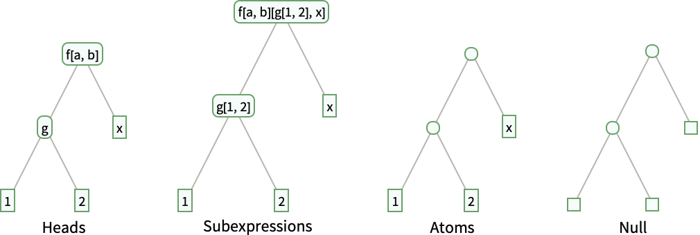 Heads include heads of expressions and their parts as subtrees - Possible structures for the expression f[a,b][g[1,2],x] with the default option setting HeadsFalse include: