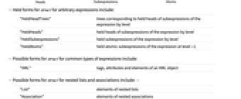 "HeldHeadTrees" trees corresponding to held heads of subexpressions of the expression by level "HeldHeads" held heads of subexpressions of the expression by level "HeldSubexpressions" held subexpressions of the expression by level "HeldAtoms" held atomic subexpressions of the expression at level -1 - Possible forms for struct for common types of expressions include: