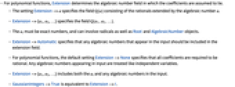 - For polynomial functions, the default setting Extension->None specifies that all coefficients are required to be rational. Any algebraic numbers appearing in input are treated like independent variables.