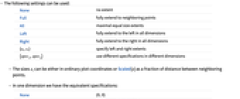 None no extent Full fully extend to neighboring points All maximal equal size extents Left fully extend to the left in all dimensions Right fully extend to the right in all dimensions {sl,sr} specify left and right extents {specx,specy} use different specifications in different dimensions - The sizes si can be either in ordinary plot coordinates or Scaled[s] as a fraction of distance between neighboring points.