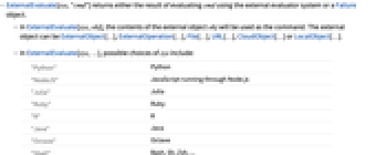 - ExternalEvaluate[sys,"cmd"] returns either the result of evaluating cmd using the external evaluator system or a Failure object.