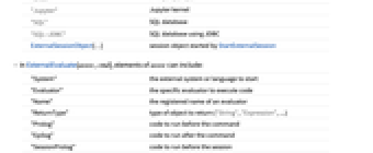 "Python" Python "NodeJS" JavaScript running through Node.js "Julia" Julia "Ruby" Ruby "R" R "Java" Java "Octave" Octave "Shell" Bash, Sh, Zsh, ... "Jupyter" Jupyter kernel "SQL" SQL database "SQL-JDBC" SQL database using JDBC ExternalSessionObject[…] session object started by StartExternalSession - In ExternalEvaluate[assoc,cmd], elements of assoc can include: