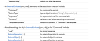 "Command" the command to execute "ReturnType" type of object to return ("String", "Expression", ...) "Arguments" the arguments to call the command with "Constants" variables to set before executing the command "TemplateArguments" template arguments, if "Command" is a template - Possible settings for obj in ExternalEvaluate[spec,obj], or for "Command" include:
