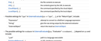 "code" the string to execute ExternalOperation[…] the external operation to execute ExternalObject[…] the external object to retrieve ExternalFunction[…] the external function to retrieve File[…] the file contents to execute URL[…] the contents given by the URL to execute CloudObject[…] the command specified by the cloud object LocalObject[…] the command specified by the local object - Possible settings for "type" in ExternalEvaluate[sys->"type",…], or for "ReturnType", include: