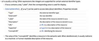 "Type" the external identifier type "ExternalID" the raw identifier "Label" the label of the resource stored in meta "Description" the description of the resource stored in meta "URL" a URL to a description of the resource "Hyperlink" a Hyperlink to a description of the resource "ConceptURI" a URL identifying the resource - The value of the "ConceptURI" identifies a resource in the semantic web. When dereferenced, it usually redirects to a machine- or human-readable description of the resource.