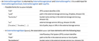 "CID" IPFS content identifier (CID) "path" path in the external storage service (e.g. Dropbox, Amazon S3) "bucket/key" bucket name and key in the external storage service (e.g. Amazon S3) "uri" external storage service URI (e.g. Amazon S3 URI) {"location1","location2",…} list of paths, keys or URIs in the external storage service - In ExternalStorageObject[assoc], the association assoc can have elements with the following keys: