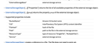 "CID" InterPlanetary File System (IPFS) content identifier "Path" path to the file in the external service or list of paths "BucketName" bucket name in the external storage service (e.g. Amazon S3) "ExternalStorageBase" external storage service - ExternalStorageObject[...]["Properties"] returns the list of all available properties of the external storage object.