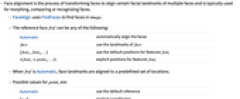 Automatic automatically align the faces face use the landmarks of face {feat1,feat2,…} use the default positions for features feati <|feat1point1,…|> explicit positions for features feati - When fref is Automatic, face landmarks are aligned to a predefined set of locations.