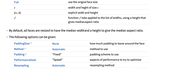 Automatic automatic choice Full use the original face size s width and height of size s {w,h} explicit width and height f function f to be applied to the list of widths, using a height that gives median aspect ratio - By default, all faces are resized to have the median width and a height to give the median aspect ratio.