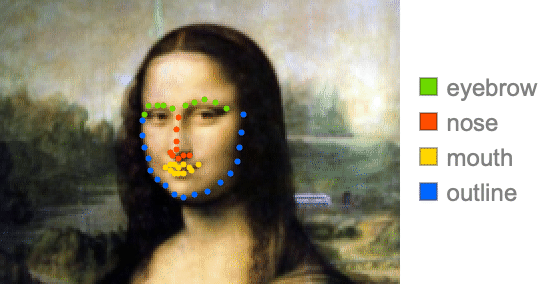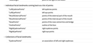 "LeftEyebrowPoints" left eyebrow points "LeftEyePoints" left eye points "MouthExternalPoints" points of the external part of the mouth "MouthInternalPoints" points of the internal part of the mouth "NosePoints" points of the nose central line and bridge "OutlinePoints" outline of the face "RightEyebrowPoints" right eyebrow points "RightEyePoints" right eye points - Collections of facial landmarks: