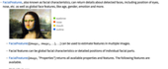 - FacialFeatures, also known as facial characteristics, can return details about detected faces, including position of eyes, nose, etc. as well as global face features, like age, gender, emotion and more.