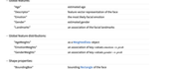 "AgeWeights" as a WeightedData object "EmotionWeights" an association of key-values emotion->prob "GenderWeights" an association of key-values gender->prob - Shape properties: