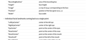 "LeftEyeCenter" center of the left eye "RightEyeCenter" center of the right eye "EyeCenter" point at the center of the eyes "NoseCenter" point at the center of the nose "MouthCenter" point at the center of the mouth "MouthLeft" point of the left of the mouth "MouthRight" point of the right of the mouth - Individual facial landmarks coming back as a list of points:
