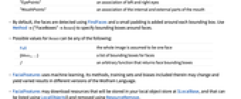 "EyebrowPoints" an association of left and right eyebrows "EyePoints" an association of left and right eyes "MouthPoints" an association of the internal and external parts of the mouth - By default, the faces are detected using FindFaces and a small padding is added around each bounding box. Use Method{"FaceBoxes"boxes} to specify bounding boxes around faces.
