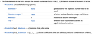 Extension None generators for the algebraic number field to be used GaussianIntegers False whether to allow Gaussian integer coefficients Modulus 0 modulus to assume for integers Trig False whether to do trigonometric as well as algebraic transformations - FactorList[poly,Modulus->p] requires that p be prime.