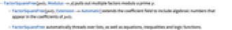 - FactorSquareFree[poly,Extension->Automatic] extends the coefficient field to include algebraic numbers that appear in the coefficients of poly.