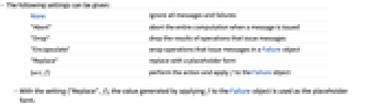None ignore all messages and failures "Abort" abort the entire computation when a message is issued "Drop" drop the results of operations that issue messages "Encapsulate" wrap operations that issue messages in a Failure object "Replace" replace with a placeholder form {act,f} perform the action and apply f to the Failure object - With the setting {"Replace",f}, the value generated by applying f to the Failure object is used as the placeholder form.