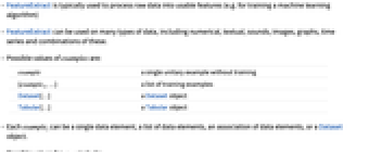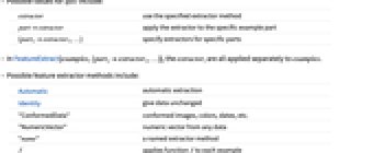 extractor use the specified extractor method partextractor apply the extractor to the specific example part {part1extractor1,…} specify extractors for specific parts - In FeatureExtract[examples,{part1extractor1,…}], the extractori are all applied separately to examples.