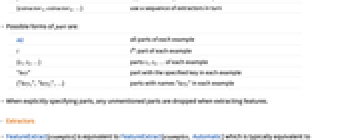 part of each example{i1,i2,…} parts i1, i2, … of each example "key" part with the specified key in each example {"key1","key2",…} parts with names "keyi" in each example - When explicitly specifying parts, any unmentioned parts are dropped when extracting features.
