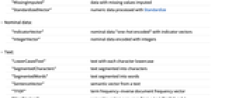 "DiscretizedVector" discretized numerical data "DimensionReducedVector" reduced-dimension numeric vectors "MissingImputed" data with missing values imputed "StandardizedVector" numeric data processed with Standardize - Nominal data:
