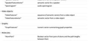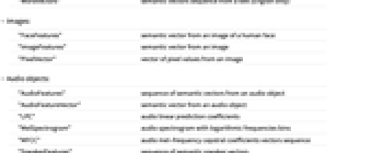 "AudioFeatures" sequence of semantic vectors from an audio object "AudioFeatureVector" semantic vector from an audio object "LPC" audio linear prediction coefficients "MelSpectrogram" audio spectrogram with logarithmic frequencies bins "MFCC" audio mel-frequency cepstral coefficients vectors sequence "SpeakerFeatures" sequence of semantic speaker vectors "SpeakerFeatureVector" semantic vector for a speaker "Spectrogram" audio spectrogram - Video objects: