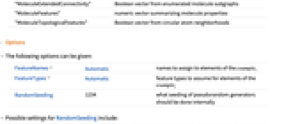 "AtomPairs" Boolean vector from pairs of atoms and the path lengths between them "MoleculeExtendedConnectivity" Boolean vector from enumerated molecule subgraphs "MoleculeFeatures" numeric vector summarizing molecule properties "MoleculeTopologicalFeatures" Boolean vector from circular atom neighborhoods - The following options can be given: