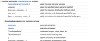FeatureExtractorFunction[…] apply the given extractor function extractor apply the specified feature extractor method {extractor1,extractor2,…} apply the sequence of extractor methods in turn specext apply extractor ext to data parts specified by spec {spec1ext1,spec2ext2,…} apply extractors exti to data parts specified by the speci - Possible feature extractor methods include: