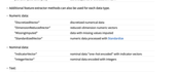 "DiscretizedVector" discretized numerical data "DimensionReducedVector" reduced-dimension numeric vectors "MissingImputed" data with missing values imputed "StandardizedVector" numeric data processed with Standardize - Nominal data: