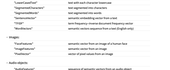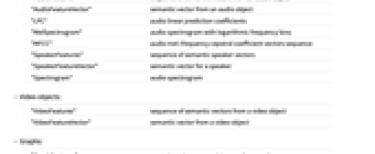 "AudioFeatures" sequence of semantic vectors from an audio object "AudioFeatureVector" semantic vector from an audio object "LPC" audio linear prediction coefficients "MelSpectrogram" audio spectrogram with logarithmic frequency bins "MFCC" audio mel-frequency cepstral coefficient vectors sequence "SpeakerFeatures" sequence of semantic speaker vectors "SpeakerFeatureVector" semantic vector for a speaker "Spectrogram" audio spectrogram - Video objects: