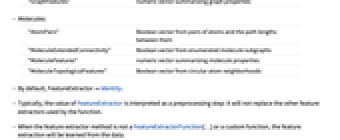 "AtomPairs" Boolean vector from pairs of atoms and the path lengths between them "MoleculeExtendedConnectivity" Boolean vector from enumerated molecule subgraphs "MoleculeFeatures" numeric vector summarizing molecule properties "MoleculeTopologicalFeatures" Boolean vector from circular atom neighborhoods - By default, FeatureExtractorIdentity.