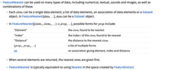 - FeatureNearest finds the nearest elements in an automatically computed feature space for diverse data types including text, images, sounds and numerical data.