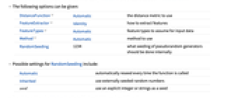 DistanceFunction Automatic the distance metric to use FeatureExtractor Identity how to extract features FeatureTypes Automatic feature types to assume for input data Method Automatic method to use RandomSeeding 1234 what seeding of pseudorandom generators should be done internally - Possible settings for RandomSeeding include: