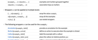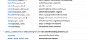 Annotation[examplei,label] provide an annotation for the example Button[examplei,action] define an action to execute when the example is clicked Callout[examplei,label] label the example with a callout Callout[examplei,label,pos] place the callout at relative position pos EventHandler[examplei,…] define a general event handler for the example Hyperlink[examplei,uri] make the example a hyperlink Labeled[examplei,label] label the example Labeled[examplei,label,pos] place the label at relative position pos Legended[examplei,label] identify the example in a legend PopupWindow[examplei,cont] attach a popup window to the example StatusArea[examplei,label] display in the status area on mouseover Style[examplei,styles] show the example using the specified styles Tooltip[examplei,label] attach a tooltip to the example Tooltip[examplei] use example values as tooltips - Callout, Labeled, Placed and LabelingFunction can use the following positions pos: