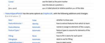 Automatic automatically placed labels Above, Below, Before, After positions around the data Center use the label as the point marker x near the data at a position x {pos,epos} epos in label placed at relative position pos of the data - FeatureSpacePlot3D has the same options as Graphics3D, with the following additions and changes: [List of all options]