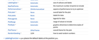 AlignmentPoint Center the default point in the graphic to align with AspectRatio Automatic ratio of height to width Axes False whether to draw axes AxesEdge Automatic on which edges to put axes AxesLabel None axes labels AxesOrigin Automatic where axes should cross AxesStyle {} graphics directives to specify the style for axes Background None background color for the plot BaselinePosition Automatic how to align with a surrounding text baseline BaseStyle {} base style specifications for the graphic Boxed True whether to draw the bounding box BoxRatios Automatic bounding 3D box ratios BoxStyle {} style specifications for the box ClipPlanes None clipping planes ClipPlanesStyle Automatic style specifications for clipping planes ContentSelectable Automatic whether to allow contents to be selected ControllerLinking False when to link to external rotation controllers ControllerPath Automatic what external controllers to try to use Epilog {} 2D graphics primitives to be rendered after the main plot FaceGrids None grid lines to draw on the bounding box FaceGridsStyle {} style specifications for face grids FeatureExtractor Identity how to extract features from which to learn FeatureNames Automatic names to assign to elements of the examplei FeatureTypes Automatic feature types to assume for elements of the examplei Filling None how to fill in stems for each point FillingStyle Automatic style to use for filling FormatType TraditionalForm default format type for text ImageMargins 0. the margins to leave around the graphic ImagePadding All what extra padding to allow for labels, etc. ImageSize Automatic absolute size at which to render the graphic LabelingFunction Automatic how to label points LabelingSize Automatic size of callouts and labels LabelingTarget Automatic how to determine automatic label positions LabelStyle {} style specifications for labels Lighting Automatic simulated light sources to use MaxPlotPoints Automatic the maximum number of points to include Method Automatic details of 3D graphics methods to use PerformanceGoal $PerformanceGoal aspects of performance to try to optimize PlotInteractivity $PlotInteractivity whether to allow interactive elements PlotLabel None overall label for the plot PlotLabels None labels for data PlotLegends None legends for data PlotRange Automatic range of values to include PlotRangePadding Automatic how much to pad the range of values PlotRegion Automatic final display region to be filled PlotStyle Automatic graphics directives to determine styles of points PlotTheme $PlotTheme overall theme for the plot PreserveImageOptions Automatic whether to preserve image options when displaying new versions of the same graphic Prolog {} 2D graphics primitives to be rendered before the main plot RandomSeeding 1234 how to seed random numbers RotationAction "Fit" how to render after interactive rotation SphericalRegion Automatic whether to make the circumscribing sphere fit in the final display area Ticks Automatic specification for ticks TicksStyle {} style specification for ticks TouchscreenAutoZoom False whether to zoom to fullscreen when activated on a touchscreen ViewAngle Automatic angle of the field of view ViewCenter Automatic point to display at the center ViewMatrix Automatic explicit transformation matrix ViewPoint {1.3,-2.4,2.} viewing position ViewProjection Automatic projection method for rendering objects distant from the viewer ViewRange All range of viewing distances to include ViewVector Automatic position and direction of a simulated camera ViewVertical {0,0,1} direction to make vertical