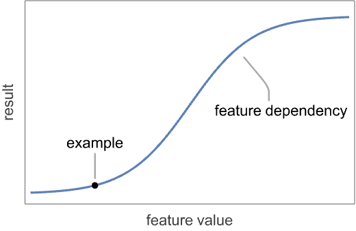 - For every example, the result of model is plotted while changing the value of a single example feature.