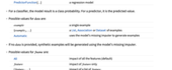 example a single example {example1,…} a List, Association or Dataset of examples Automatic uses the model's missing imputer to generate examples - If no data is provided, synthetic examples will be generated using the model's missing imputer.