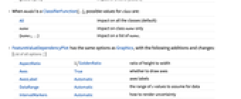 All impact on all the classes (default) name impact on class name only {name1,…} impact on a list of namei - FeatureValueDependencyPlot has the same options as Graphics, with the following additions and changes: [List of all options]