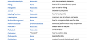 AlignmentPoint Center the default point in the graphic to align with AspectRatio 1/GoldenRatio ratio of height to width Axes True whether to draw axes AxesLabel Automatic axes labels AxesOrigin Automatic where axes should cross AxesStyle {} style specifications for the axes Background None background color for the plot BaselinePosition Automatic how to align with a surrounding text baseline BaseStyle {} base style specifications for the graphic ContentSelectable Automatic whether to allow contents to be selected CoordinatesToolOptions Automatic detailed behavior of the coordinates tool DataRange Automatic the range of x values to assume for data Epilog {} primitives rendered after the main plot Filling None how to fill in stems for each point FillingStyle Automatic style to use for filling FormatType TraditionalForm the default format type for text Frame False whether to put a frame around the plot FrameLabel None frame labels FrameStyle {} style specifications for the frame FrameTicks Automatic frame ticks FrameTicksStyle {} style specifications for frame ticks GridLines None grid lines to draw GridLinesStyle {} style specifications for grid lines ImageMargins 0. the margins to leave around the graphic ImagePadding All what extra padding to allow for labels etc. ImageSize Automatic the absolute size at which to render the graphic IntervalMarkers Automatic how to render uncertainty IntervalMarkersStyle Automatic style for uncertainty elements Joined True whether to join points LabelingFunction Automatic how to label points LabelingSize Automatic maximum size of callouts and labels LabelStyle {} style specifications for labels Method Automatic details of graphics methods to use MultiaxisArrangement None how to arrange multiple axes for data PerformanceGoal $PerformanceGoal aspects of performance to try to optimize PlotLabel Automatic overall label for the plot PlotLabels Automatic labels for data PlotLayout "Overlaid" how to position data PlotLegends None legends for data PlotMarkers None markers to use to indicate each point PlotRange Automatic range of values to include PlotRangeClipping True whether to clip at the plot range PlotRangePadding Automatic how much to pad the range of values PlotRegion Automatic the final display region to be filled PlotStyle Automatic graphics directives to determine styles of points PlotTheme $PlotTheme overall theme for the plot PreserveImageOptions Automatic whether to preserve image options when displaying new versions of the same graphic Prolog {} primitives rendered before the main plot RotateLabel True whether to rotate y labels on the frame ScalingFunctions Automatic how to scale individual coordinates TargetUnits Automatic units to display in the plot Ticks Automatic axes ticks TicksStyle {} style specifications for axes ticks