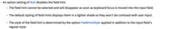 - The field hint cannot be selected and will disappear as soon as keyboard focus is moved into the input field.
