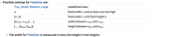 Tiny, Small, Medium, Large predefined sizes w fixed width w and at least one line high {w,h} fixed width w and fixed height h {{wmin,wmax},…} width between wmin and wmax {…,{hmin,hmax}} height between hmin and hmax - The width for FieldSize is measured in ems; the height in line heights.
