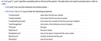 "CreationDate" date when the file was created "LastAccessDate" time when the file was last accessed "LastModificationDate" time when the contents of the file were last modified "LastChangeDate" time when a file attribute was last changed "FileType" file type "ByteCount" file size in bytes "RawByteCount" how much space in bytes the file uses on disk "BlockCount" number of blocks the file uses "BlockSize" size of one block "FileAssociation" program associated with the file "UnixPermissionsCode" permissions in numeric form (e.g. 2774) "UnixPermissionsString" permissions in string form (e.g. "rwxrwsr--") "Device" name of the device on which the file lives. "UID" user ID "GID" group ID "SID" user's Security Identifier "OwnerName" owner of the file