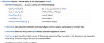 "file" or File["file"] file name, searched for on $Path "url" or URL["url"] HTTP, HTTPS or FTP URL CloudObject[…] a cloud object LocalObject[…] a local object DataConnectionObject[…] a connection object - FileFormat uses heuristic methods, and may not give correct results, particularly for shorter files.